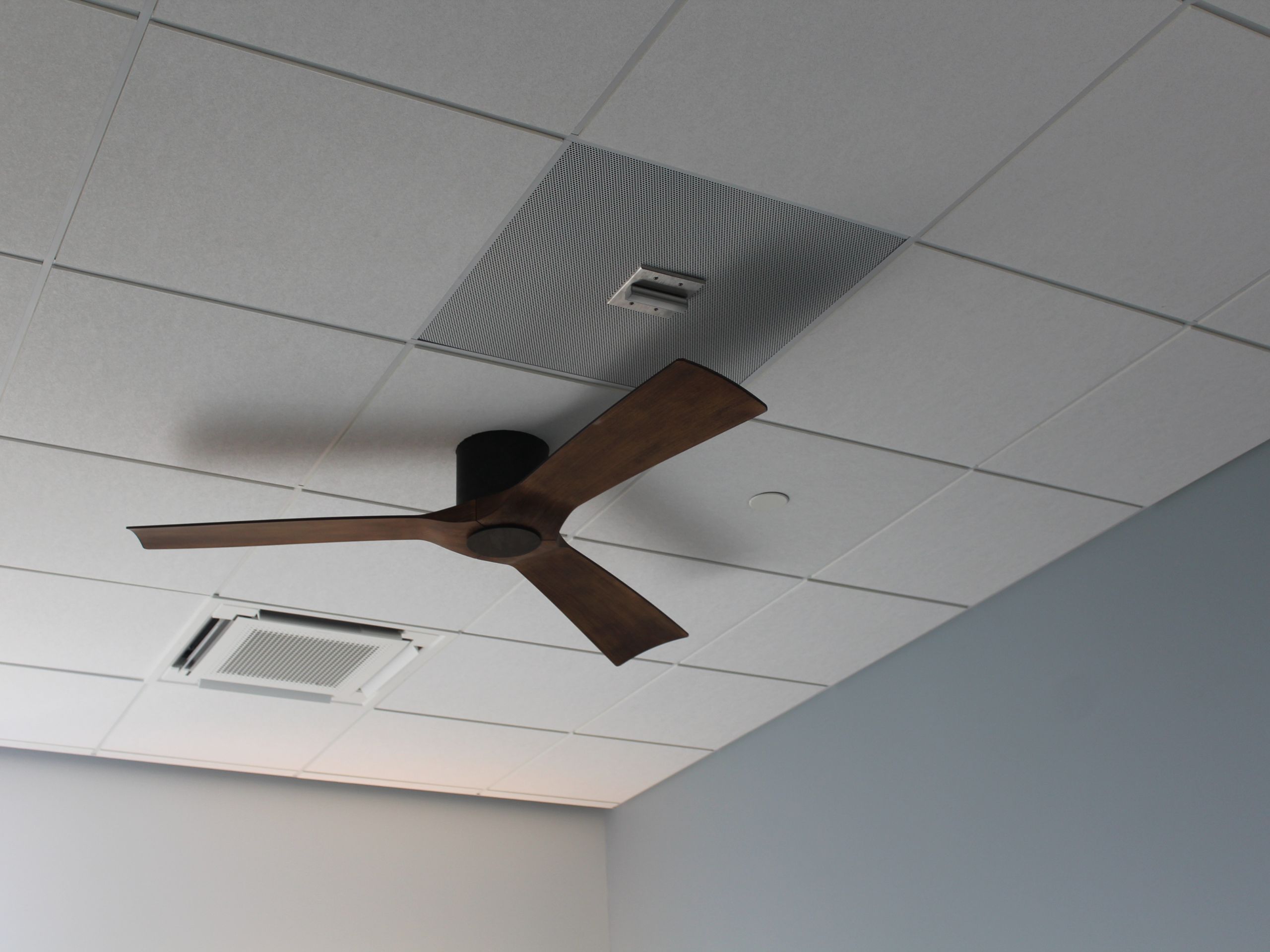 To meet more demanding acoustic needs, Ecophon Focus E ceiling tiles were delivered. These will deliver superior sound control to the building. Additionally, the CertainTeed Black HD 15/16” Classic Stab Grid provided structural strength and a bold visual for specialty zones such as media rooms and performance areas.